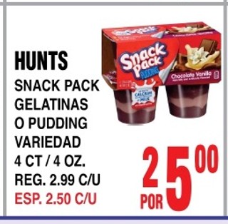 HUNTS SNACK PACK GELATINAS O PUDDING VARIEDAD 4 CT/4 OZ.