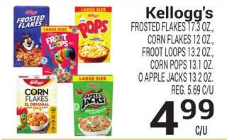 Kellogg's FROSTED FLAKES 17.3 OZ., CORN FLAKES 12 OZ. FROOT LOOPS 13.2 OZ., CORN POPS 13.1 OZ. O APPLE JACKS 13.2 OZ.