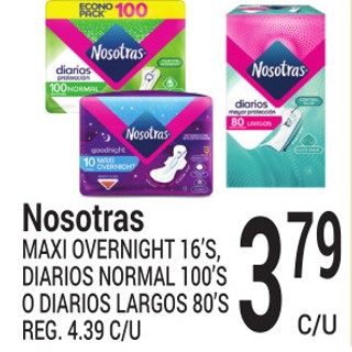 Nosotras maxi overnight 16´s, diarios normal 100´s o diarios largos 80´s