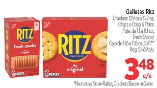 Galletas Ritz Crackers 12.9 oz a 13.7 oz, Chips o Crisp & Thins Pqte de 7.1 a 8.1 oz, Fresh Stacks Caja de 11.6a 11.8 oz, SVT**