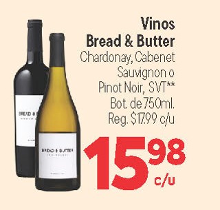 Vinos bread & butter chardonay, cabenet sauvignon o pinot noir, SVT* bot. de 750 ml.
