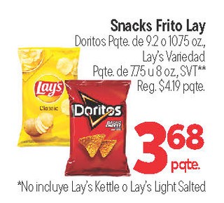 Snacks Frito Lay Doritos Pqte. de 9.2 o 1075 oz., Lay's Variedad Pqte. de 7.75 u 8 oz, SVT**