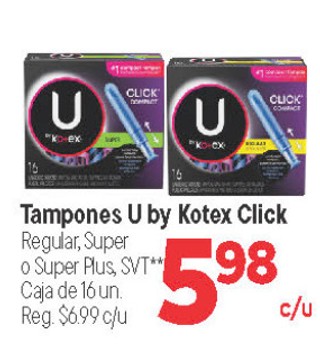 Tampones U by Kotex Click Regular, Super o Super Plus, SVT** Caja de 16 un.
