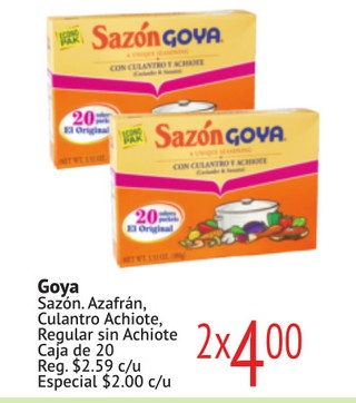 Goya Sazón. Azafrán, Culantro Achiote, Regular sin Achiote Caja de 20