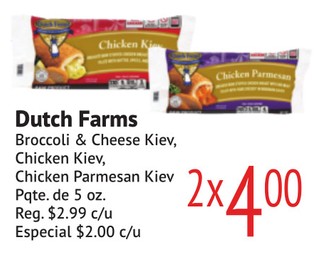 Dutch Farms Broccoli & Cheese Kiev, Chicken Kiev, Chicken Parmesan Kiev Pqte. de 5 oz.