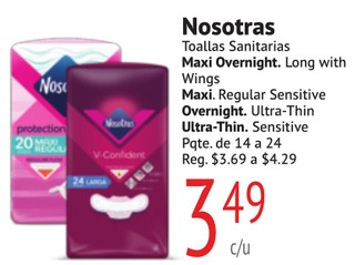 Nosotras Toallas Sanitarias Maxi Overnight. Long with Wings Maxi. Regular Sensitive Overnight. Ultra-Thin Ultra-Thin. Sensitive Pqte. de 14 a 24