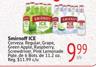 Smirnoff ICE Cerveza. Regular, Grape, Green Apple, Raspberry, Screwdriver, Pink Lemonade Pqte. de 6 Bots. de 11.2 oz.