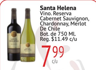 Santa Helena Vino. Reserva Cabernet Sauvignon, Chardonnay, Merlot De Chile Bot. de 750 ML.