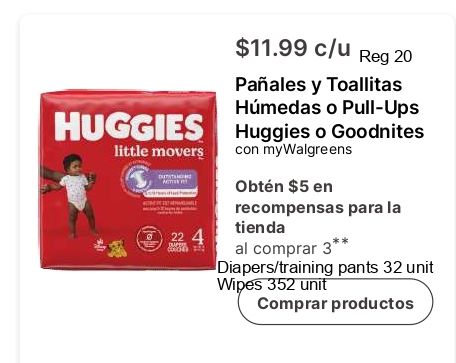 $c/u pañales toallitas húmedas pull-ups huggies goodnites little movers mywalgreens obtén recompensas tienda comprar diapers/training pants unit wipes productos