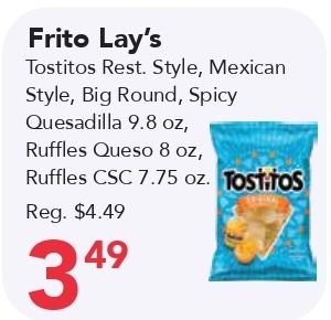 frito lay's tostitos rest style mexican style, round, spicy quesadilla ruffles queso reg.