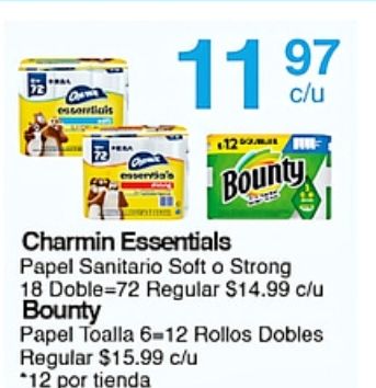 essentials esservial +bounty charmin papel sanitario soft strong doble regular $c/u bounty toalla rollos dobles *por tienda