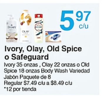 ivory olay, spice safeguard onzas, olay onzas body wash variedad jabón paquete regular $c/u *por tienda