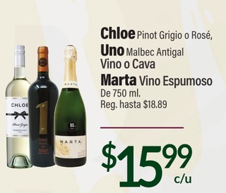 Chloe Pinot Grigio o Rosé, Uno Malbec Antigal Vino o Cava Marta Vino Espumoso De 750 ml.