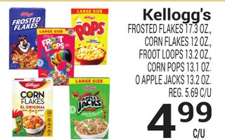Kellogg's Frosted Flakes 17.3 oz., Corn Flakes 12 oz., Froot Loops 13.2 oz., Corn Pops 13.1 oz., o Apple Jacks 13.2 oz.,