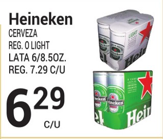 Heineken cerveza reg. o light lata 6/8.5 oz.