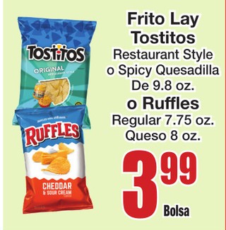 Frito Lay Tostitos Restaurant Style o Spicy Quesadilla De 9.8 oz. o Ruffles Regular 7.75 oz. Queso 8 oz.