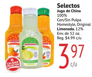 Selectos Jugo de China 100% Con/Sin Pulpa Homestyle, Original Limonada. 12% Env. de 52 oz.