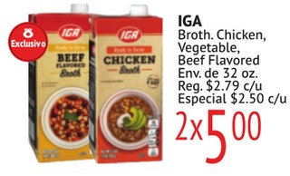IGA Broth. Chicken Vegetable, Beef Flavored Env. de 32 oz.