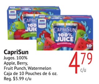 CapriSun Jugos. 100% Apple, Berry, Fruit Punch, Watermelon Caja de 10 Pouches de 6 oz.