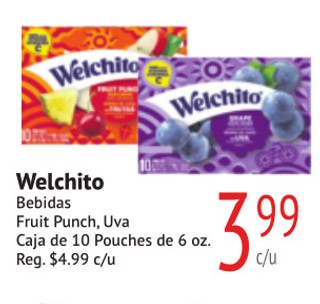 Welchito Bebidas Fruit Punch, Uva Caja de 10 Pouches de 6 oz.