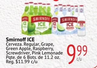 Smirnoff ICE Cerveza. Regular, Grape, Green Apple, Raspberry, Screwdriver, Pink Lemonade Pqte. de 6 Bots. de 11.2 oz.