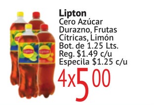 Lipton Cero Azúcar Durazno, Frutas CÃtricas, Limón Bot. de 1.25 Lts.