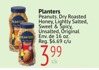 Planters Peanuts. Dry Roasted Honey, Lightly Salted, Sweet & Spicy, Unsalted, Original Env. de 16 oz.