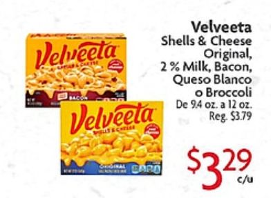 velveeta albard shells cheese original milk, bacon, queso blanco broccoli reg.