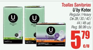 Toallas sanitarias U by Kotex regular, heavy de 28, 30, 40, 44 o 48 ud.