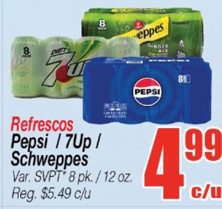 Refrescos Pepsi /7Up /Schweppes Var. SVPT* 8 pk. /12 oz.