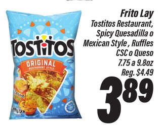 Frito Lay Tostitos Restaurant, Spicy Quesadilla o Mexican Style, Ruffles CSC o Queso 7.75 a 9.8oz.