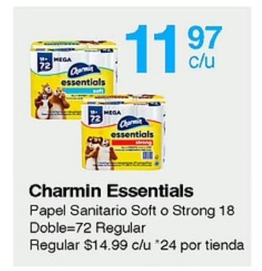 mega charmin essentials papel sanitario soft strong doble regular $c/u *por tienda