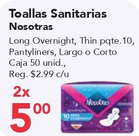 toallas sanitarias long overnight thin pqte pantyliners, corto caja unid., reg. $c/u 'nosotras
