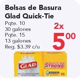 bolsas basura glad quick-tie pqte alones pqte. reg. $c/u strong