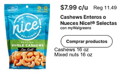 nice! delicious roasted whole cashews salt $c/u enteros nueces nice!® selectas mywalgreens comprar productos mixed nuts