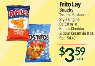 Frito Lay Snacks Tostitos Restaurant Style Original De 9.8oz. o Ruffles Cheddar & Sour Cream de 8 oz.