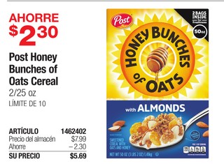 Post Honey Bunches of Oats Cereal 2/25 oz LÃMITE DE 10
