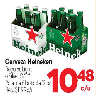 Cerveza heineken regular, light o silver SVT* pqte. de 6 bots. de 12 oz.