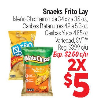 Snacks Frito Lay Isleño Chicharron de 3.4 oz a 3.8 oz, Caribas Platanutres 4.9 a 5.3 oz Caribas Yuca 4.85 oz Variedad, SVT**