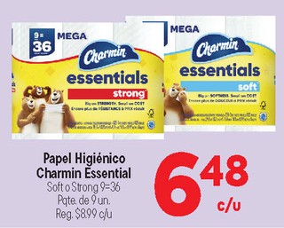 Papel Higiénico Charmin Essential Soft o Strong 9-36 Pqte, de 9 un.