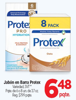 Jabon en barra protex variedad, SVT* pqte. de 6 u 8 un. de 3.7 oz.