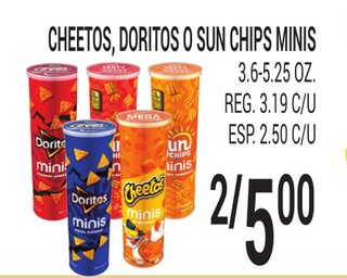 Cheetos, doritos o sun chips minis 3.6-5.25 oz.