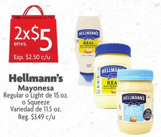 Hellmann's Mayonesa Regular o Light de 15 oz. o Squeeze Variedad de 11.5 oz.