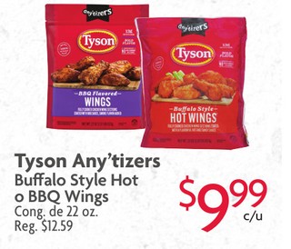 Tyson Any'tizers Buffalo Style Hot o BBQ Wings Cong. de 22 oz.