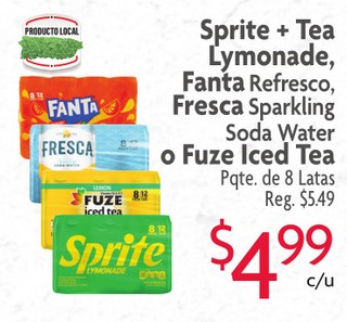 Sprite + Tea Lymonade, Fanta Refresco, Fresca Sparkling Soda Water o Fuze Iced Tea Pqte. de 8 Latas