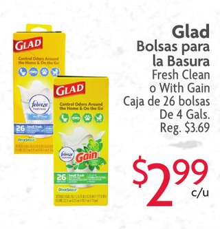 Glad Bolsas para la Basura Fresh Clean o With Gain Caja de 26 bolsas De 4 Gals.