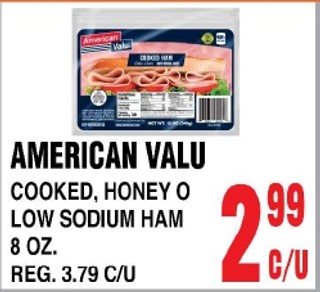AMERICAN VALU COOKED, HONEY Ο LOW SODIUM HAM 8 OZ.