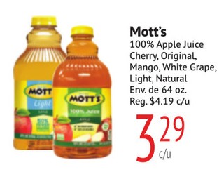 Mott's 100% Apple Juice Cherry, Original, Mango, White Grape, Light, Natural Env. de 64 oz.