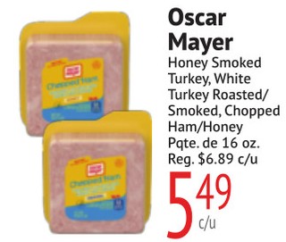 Oscar Mayer Honey Smoked Turkey, White Turkey Roasted/ Smoked, Chopped Ham/ Honey Pqte. de 16 oz.