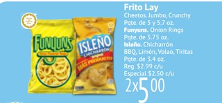 Frito Lay Cheetos, Jumbo, Crunchy Pqte. de 5 y 5.7 oz. Funyuns. Onion Rings Pqte. de 5.75 oz. Isleño. Chicharron BBQ, Limon, Volao, Tiritas Pqte. de 3.4 oz